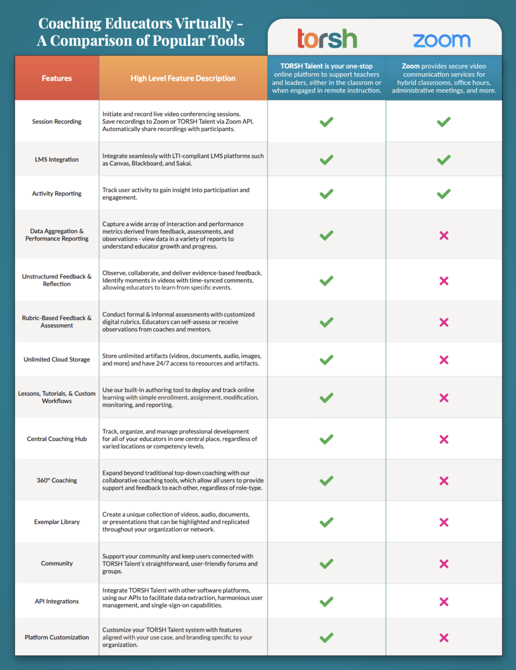 TORSH Talent is built to compliment video platforms like Zoom, not to compete. Zoom’s capabilities are known by most; it is where TORSH Talent continues to carry that value through specifically for those in the education space that makes the combination a game-changer for educational organizations.